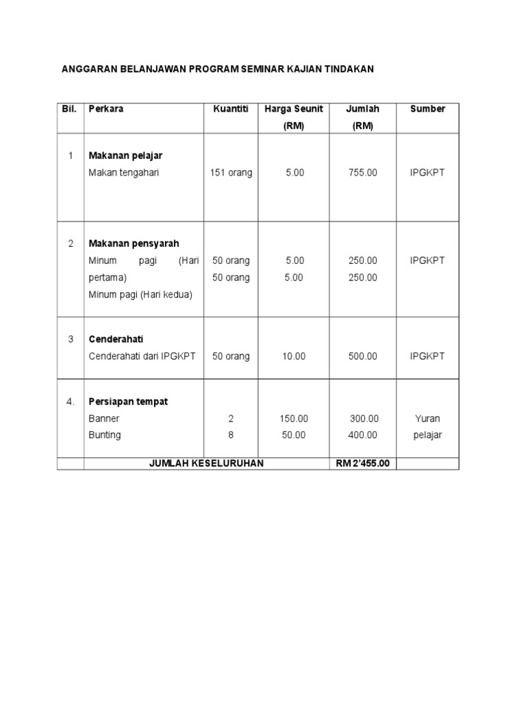 Anggaran Belanjawan Program Seminar Kajian Tindakan Pdf