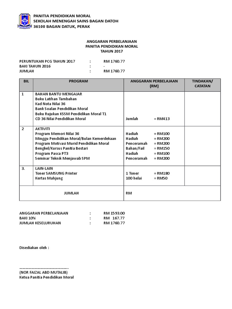 View contoh_anggaran_belanjawan_dan_tentatif_program_motivasidocx from KOKUM 01903 at University of Malaysia Sabah. PROGRAM KECERIAAN KAWASAN SEKOLAH BERSIH ITU INDAH PERKEMBANGAN PROFESIONAL KEGURUAN HBEF2803 PERKEMBANGAN PROFESIONALISMA KEGURUAN KECERIAAN SEKOLAH 10 Muqadimah f Keceriaan di kawasan sekolah merupakan satu aspek yang penting dalam menjamin keselesaan murid dan guru disekolah. Jumlah murid 25 orang.