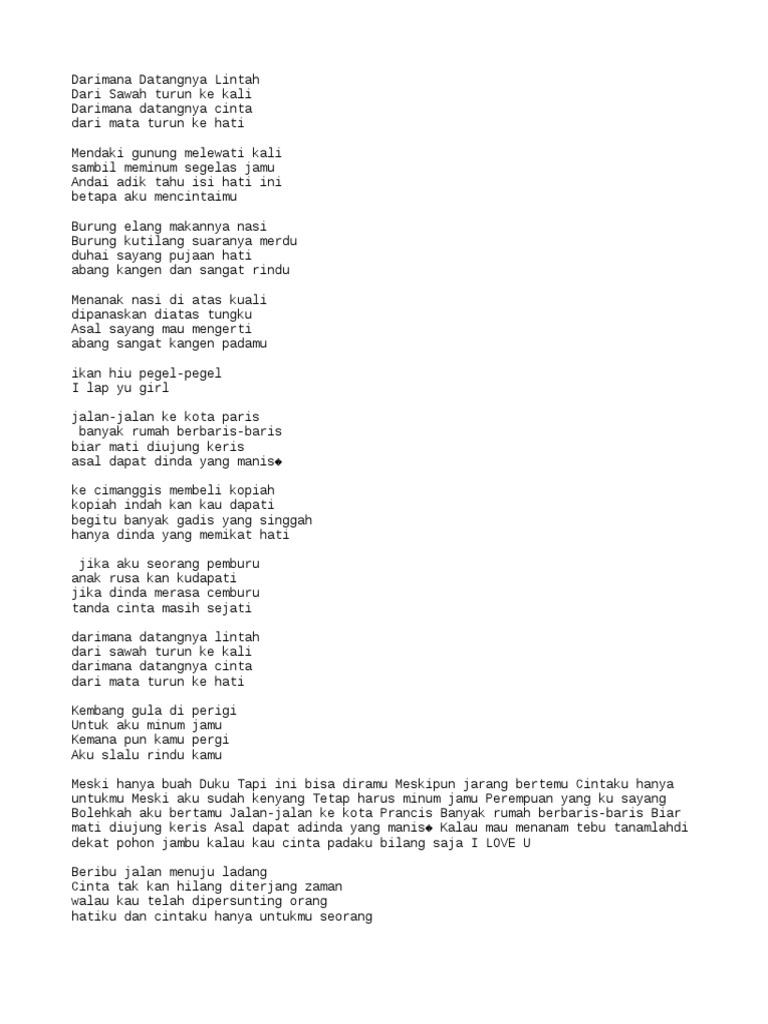 Dari mana datangnya cinta Dari mata turun ke hati. Untuk apa bermain kata Kalau berpuisi saja tidak bisa. Dari mana datangnya linta Dari sawah turun ke kali Dari mana datangnya cinta Dari mata turun ke hati.